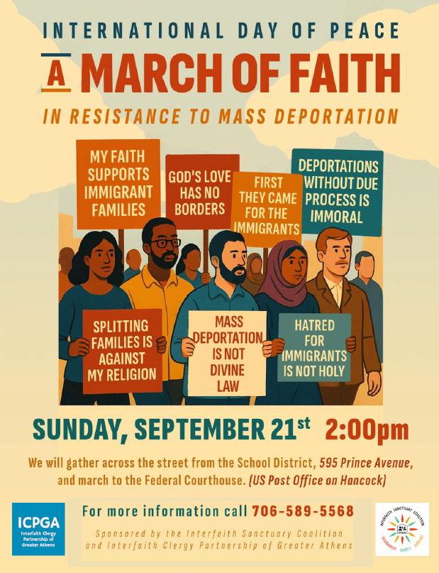 “Religious leaders will speak on moral calls to support immigrant neighbors, to oppose mass deportation, and to end family separation,” commented Rev. Dr. Pippin Whitaker, minister of the Unitarian Universalist Fellowship of Athens and co-chair of the Interfaith Clergy Partnership of Greater Athens (ICPGA), which voted unanimously to cosponsor and participate in the march.